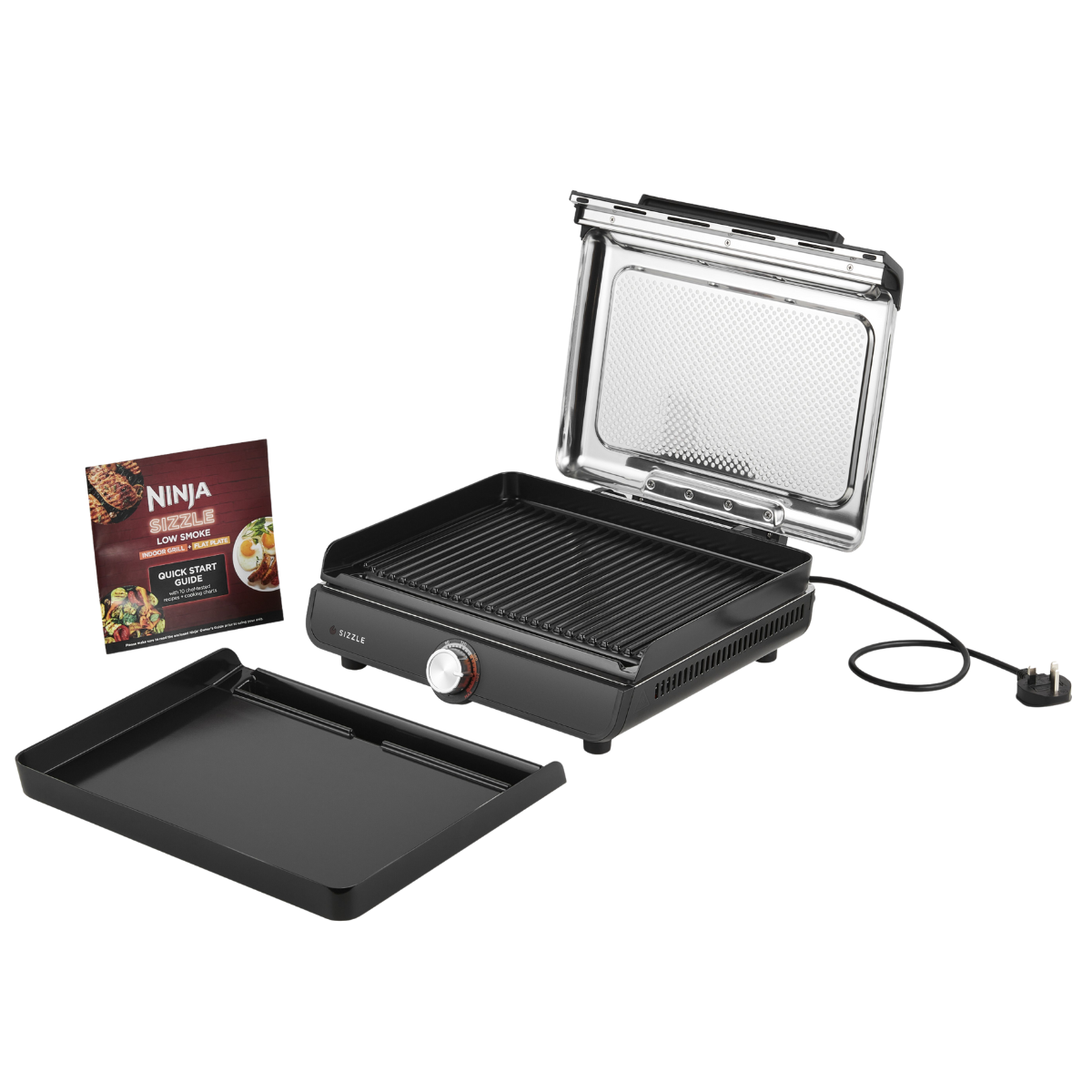 Ninja Sizzle Indoor Grill & Flat Plate GR101 este proiectat pentru a oferi rezultate autentice de grătar la interior, fără fumul deranjant. Plăcile interschimbabile pentru grătar și plită (tip plancha) îți permit să treci ușor de la prepararea micului dejun la cina de familie. Cu o capacitate suficient de mare pentru a găti până la 6 burgeri, piept de pui sau clătite, acest grill este perfect pentru întreaga familie.