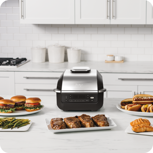 Util de la micul dejun la cină, Ninja Grill & Airfryer EG351 vine cu 5 funcții de gătit personalizabile: Grătar, Prăjire cu aer cald, Rumenire, Coacere și Deshidratare. În plus, economisești timp în bucătărie deoarece nu mai trebuie să aștepți să se decongeleze carnea; poți găti direct, păstrând același gust impecabil!